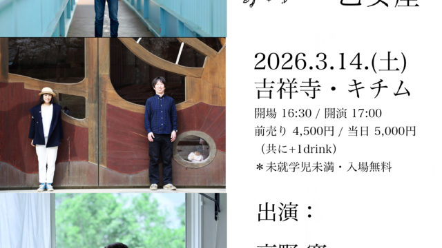この度はじめてのライブを、キチムさんにて行うことになり、とても嬉しく思います。と同時に少し緊張も…(笑)優柔不断な私はいつも、そんなアンビバレントな感情に包まれることが多く、喜びの中に哀しみを、哀しみの中に喜びを、と日々様々な色に囲まれてい...