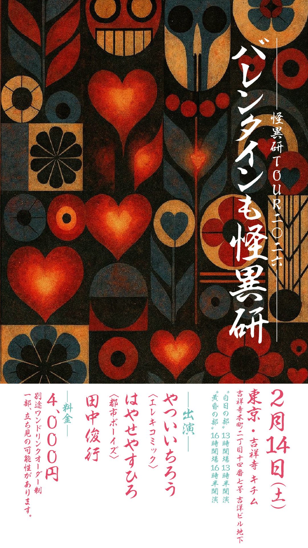 出演 怪異研:やついいちろう(エレキコミック)、はやせやすひろ(都市ボーイズ)、田中俊行